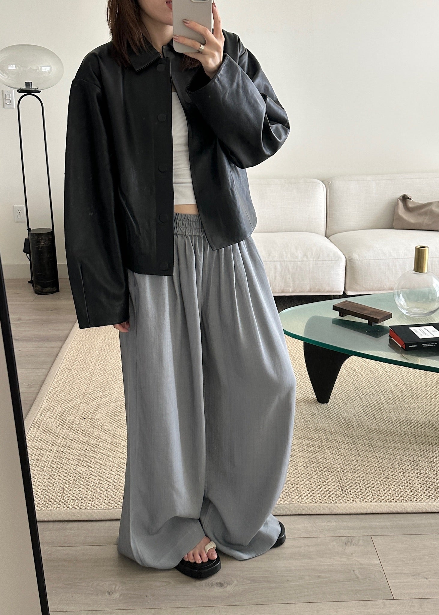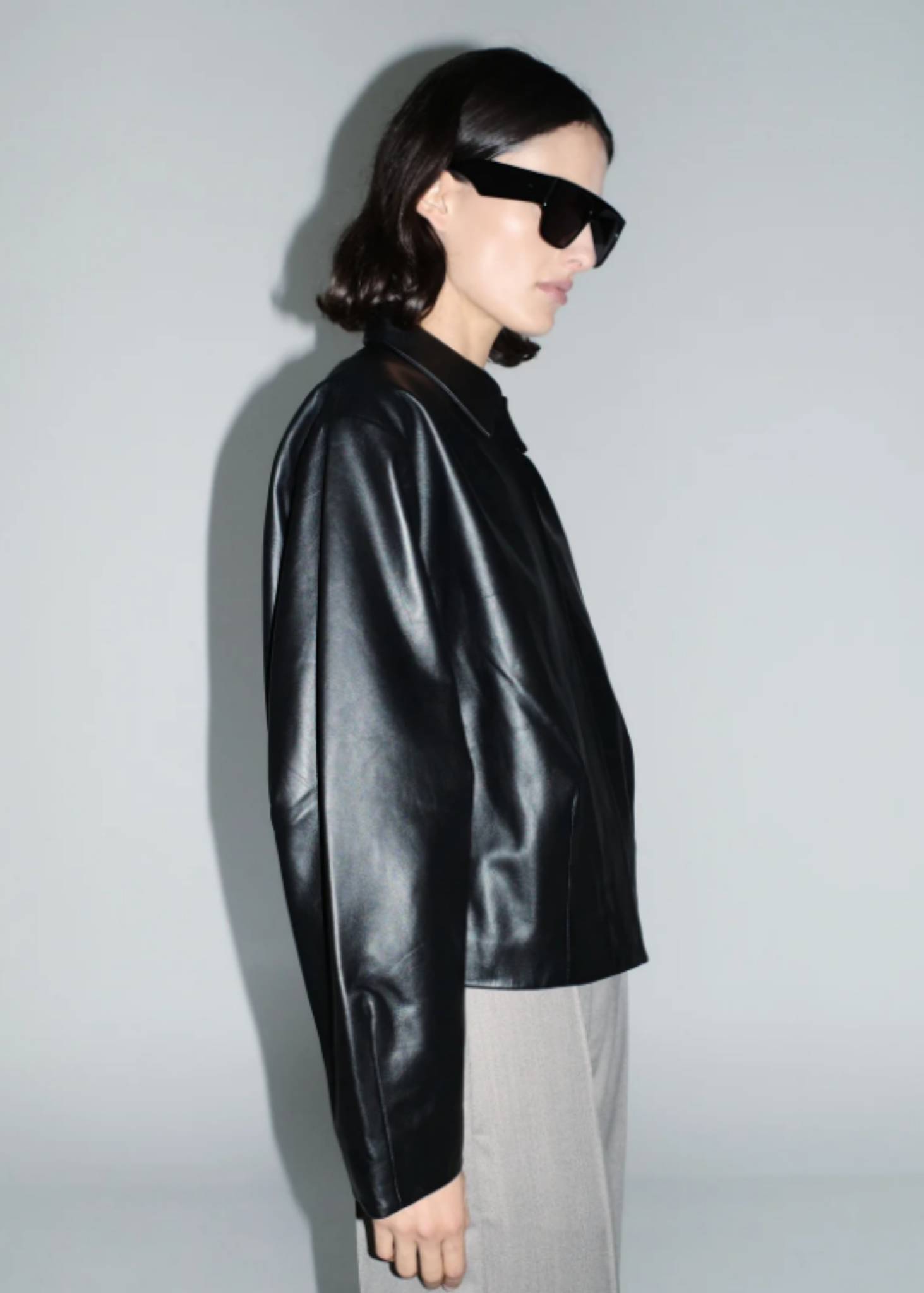 - Pointed collar, concealed magnetic buttons, cocoon silhouette,